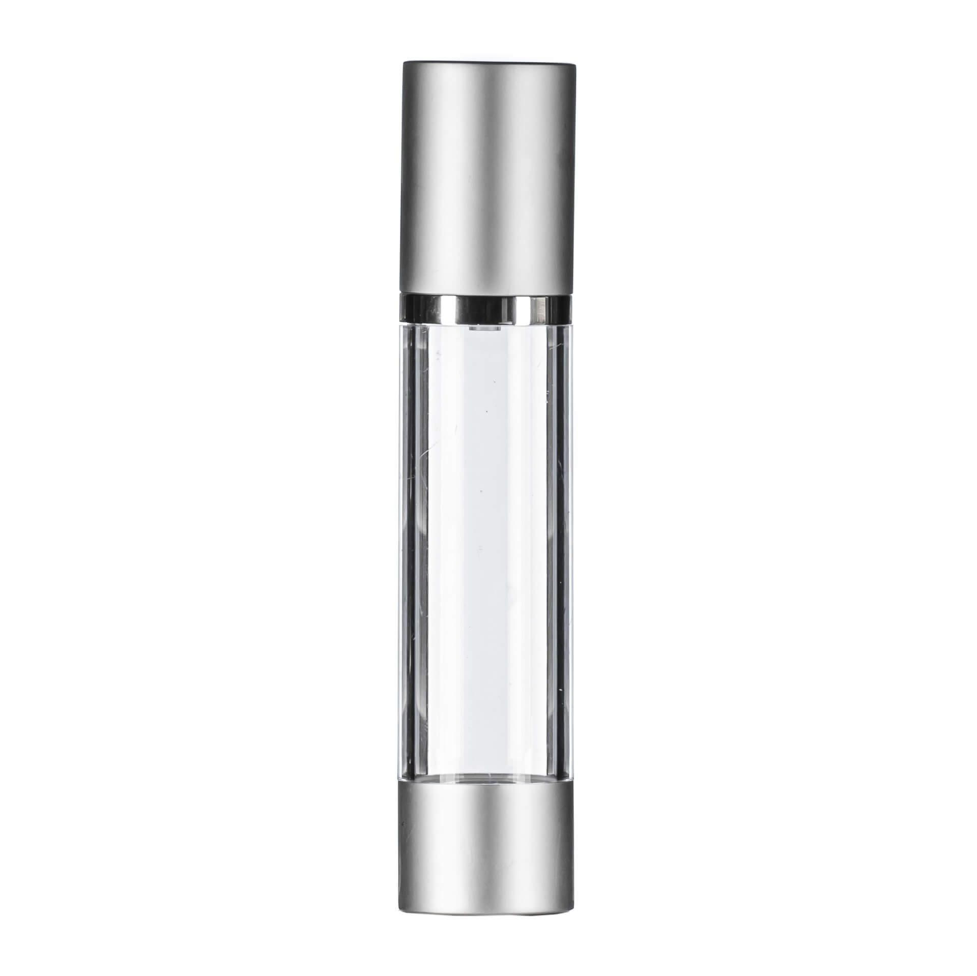 The 50ml Clear Airless Bottle combines sophistication with functionality, providing an advanced packaging solution for your skincare and cosmetic products. Featuring a modern matte silver base and a shiny gloss silver collar, this airless bottle ensures your formulations are both stylishly presented and well-protected.